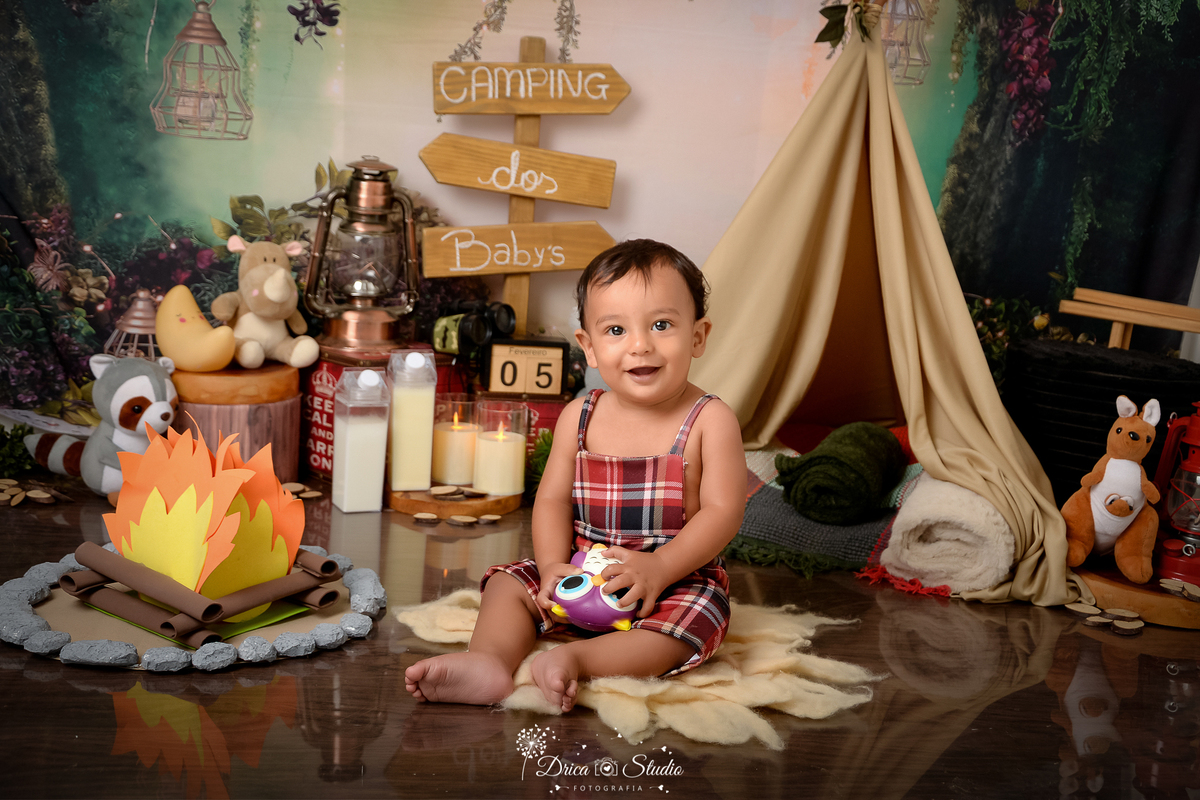 drica studio-ensaio fotografico infantil - acampamento infantil - xinguara - pará - bebê deitado de bruços - fogueira de eva - plaquinhas de indicação - bichinhos de pelúcia - violãozinho - cabaninha - caixa de leite - piso amadeirado -fundo tema floresta