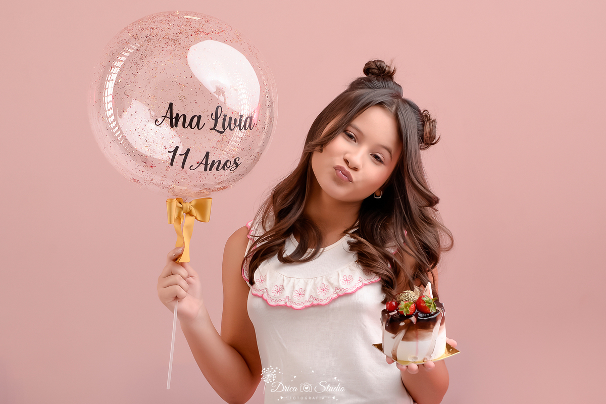 Drica studio - ensaio fotografico infantil - xinguara - pará - Ensaio de aniversário infantil 11 anos, menina com penteado estilizado segurando balão personalizado “Ana Lívia 11 anos” e mini bolo, fundo rosa em estúdio fotográfico.