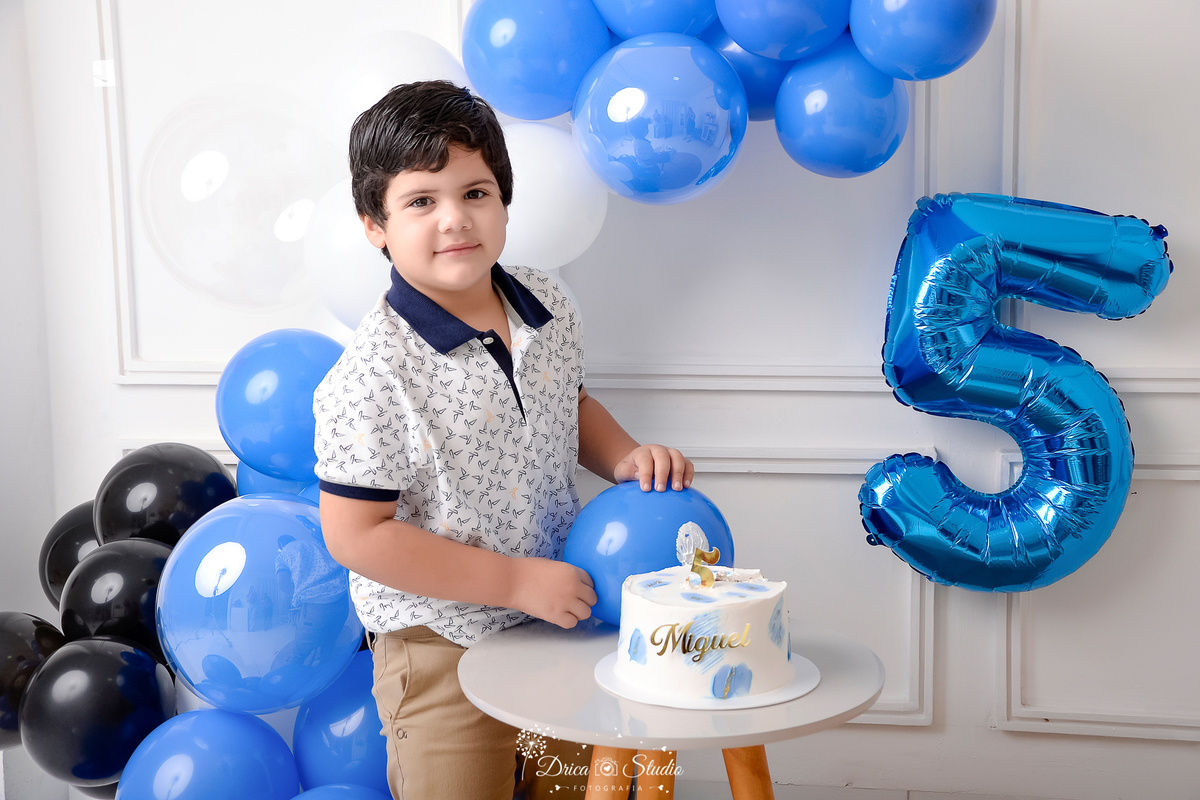 drica studio - ensaio fotografico infantil - 5 anos - xinguara - pará -menino segurando balão azul proximo a bolo de anivesário - balão número 5 - camisa branca com detalhe azul - calã bege - fundo branco co boiserie