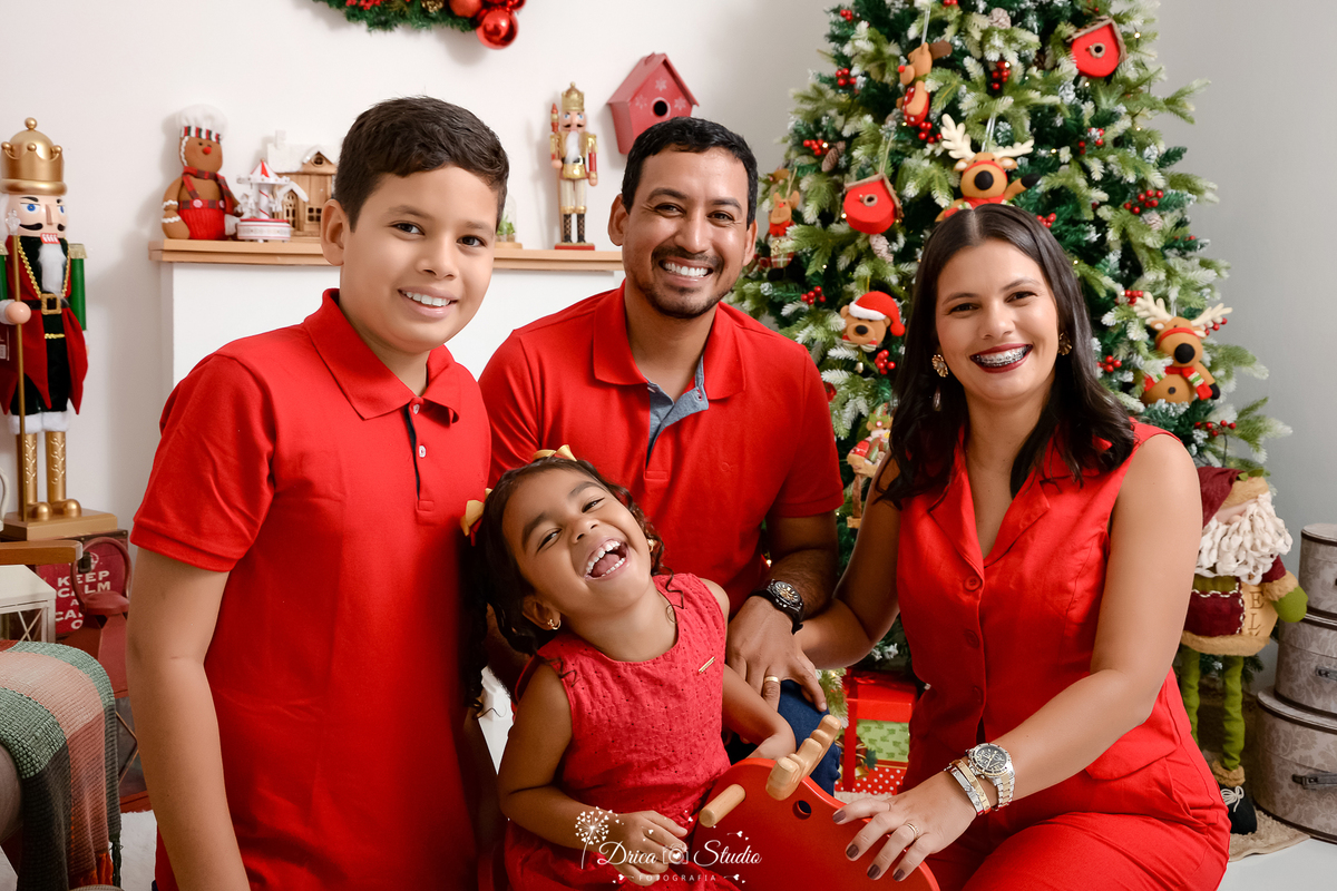 drica studio-ensaio fotográfico-família-natal-xinguara-pará-familia posam para foto em cenário de natal-mãe e filha vestem vestido vermelho e pai e filho camisa vermelha e jean - decoração de natal - fundo clean