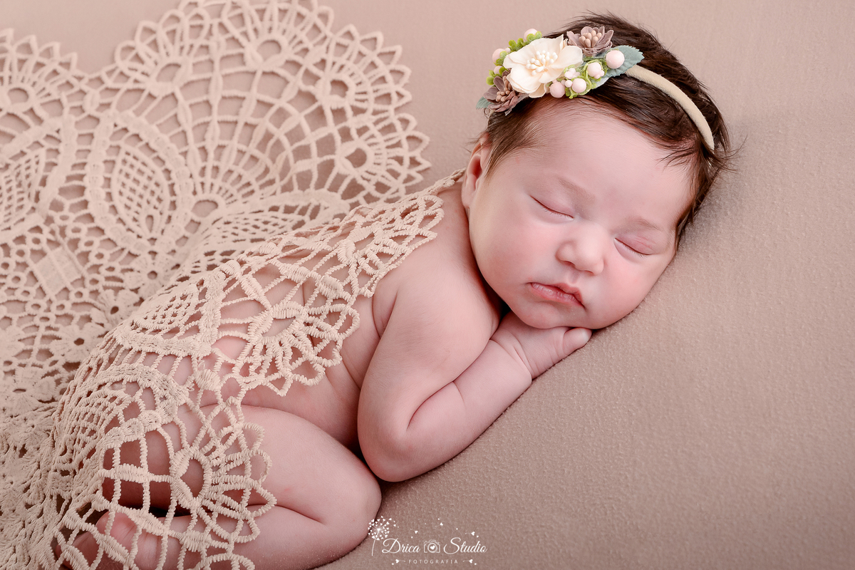 drica studio - ensaio fotografico infantil - newborn - xinguara - recém nascido deitado de bruço em posição fetal, coberto com manta de renda bege, usando aplique floral na cabeça - fundo neutro