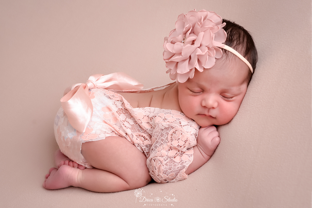 drica studio - ensaio fotográfico infantil - newborn - xinguara - bebê deitada de bruços sobre superficie marcia, vestindo bory rose de renda com laço de cetim e tiara com uma flor grande na cabeça, fundo bege