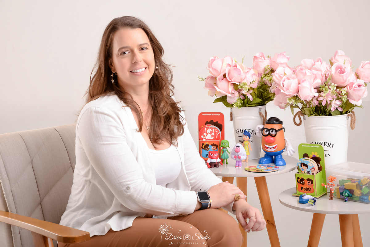 Psicóloga infantil em ensaio drica studio - ensaio fotografico profissional - psicologia infantil - xinguara - pará-profissional sentada em poltrona, sorrindo, com brinquedos terapêuticos e flores ao fundo.