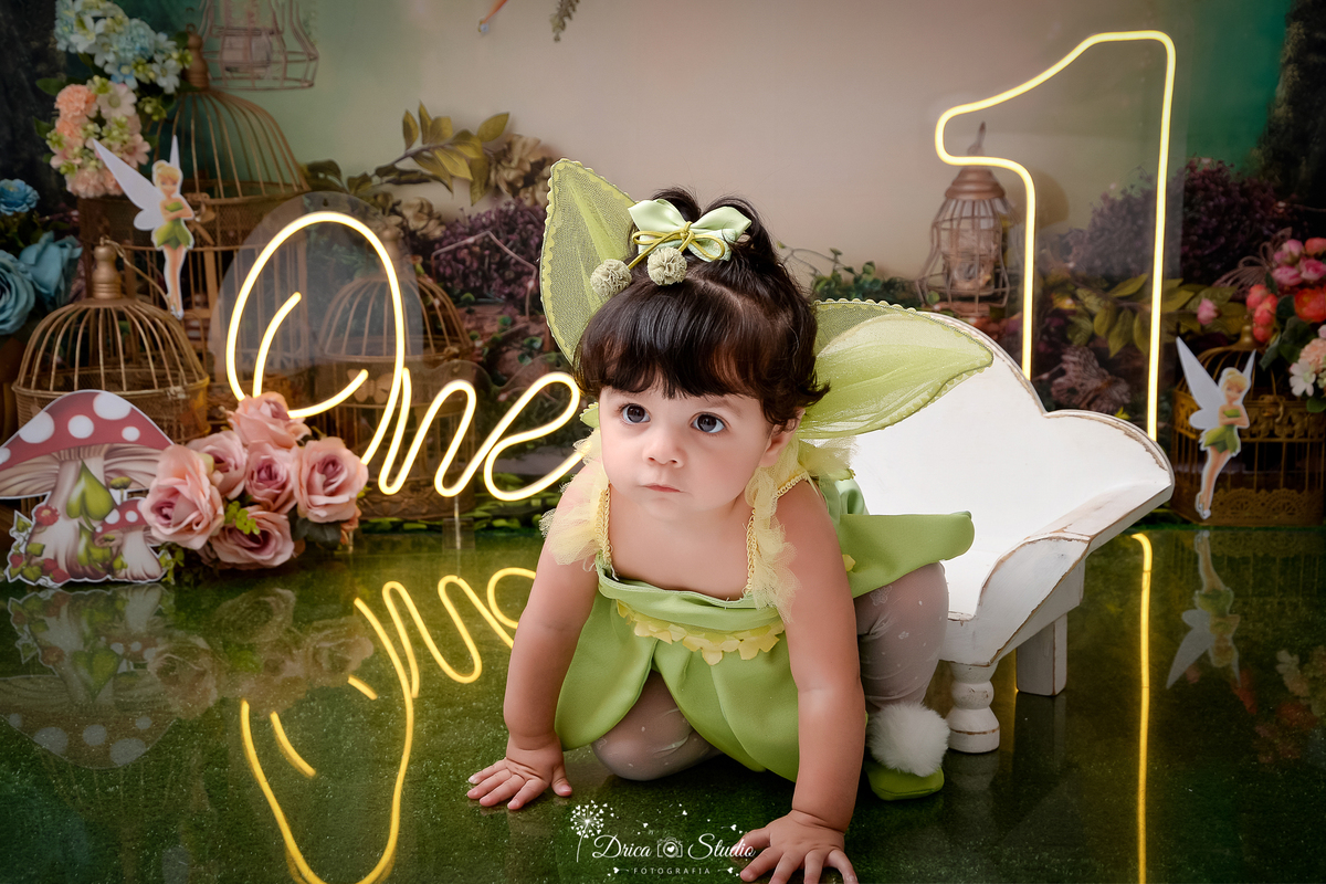 DRICA STUDIO - ENSAIO FOTOGRAFICO INFANTIL - SMASH THE CAKE - TINKER BELL - XINGUARA - BEBÊ VESTIDA DE TINKER BELL ENGATINHANDO - UM DE LED - ONE DE LED -CESTOS COM ROSAS - SININHO